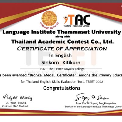 ที่ได้รับรางวัล Bronze Medal Certificate จากโครงการประเมินทักษะภาษาอังกฤษระดับประเทศ ครั้งที่ 3 (TESET)