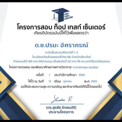 ขอแสดงความยินดีกับเด็กชายปรมะ อิศราถรณ์ ชั้นป.1/3 ได้รางวัลเหรียญทอง รายการ แข่งขันภาษาอังกฤษ ระดับประถมศึกษาตอนต้น 1-3 โดยได้คะแนน 189 คะแนนจาก 200 คะแนนเต็ม (สอบ online) เมื่อวันที่ 25 สิงหาคม 2565 จัดโดย TOP TEST CENTER –โครงการทดสอบ และพัฒนาศักยภาพทางวิชาการ ระดับประเทศ