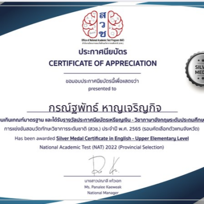 ที่สอบได้คะแนนเกินเกณฑ์มาตรฐาน และได้รับประกาศนียบัตรเหรียญเงิน-วิชาภาษาอังกฤษระดับประถมศึกษาตอนปลาย ในการแข่งขันสอบวัดทักษะวิชาการระดับชาติ (สวช.) ประจำปี พ.ศ.2565 (รอบคัดเลือกตัวแทนจังหวัด)