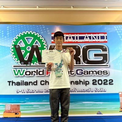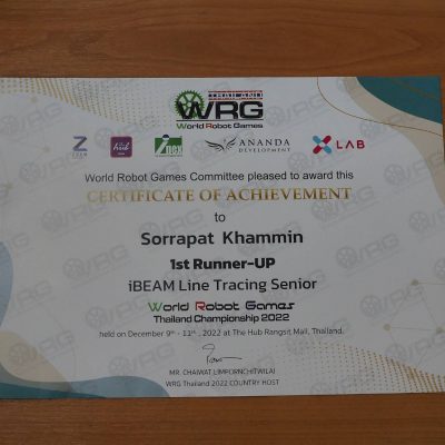 ขอแสดงความยินดีกับ นายสรภัส คำมินทร์ ชั้น ม.5/7 ที่ได้รับรางวัลเหรียญเงิน รองชนะเลิศอันดับที่ 1 รายการWorld Robot Games Thailand Championship 2022 ประเภท iBEAM Line Tracing Senior เมื่อวันที่ 9 – 11 ธันวาคม 2022 ณ ศูนย์การค้าเดอะฮับ รังสิต จัดโดย INEX Innovative Experiment Co., Ltd.