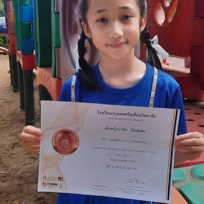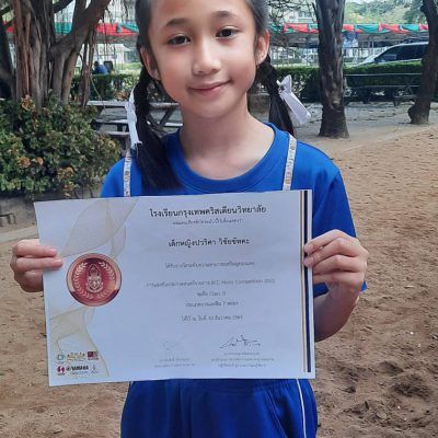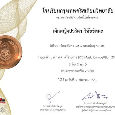 ขอแสดงความยินดีกับเด็กหญิงปวริศา วิชัยขัทคะ ชั้น ป.2/4 เข้าร่วมการแข่งขันดนตรีไทยและขับร้อง รายการ Bangkok Christian College Music Competition 2022 ได้รับ รางวัลเหรียญทองแดง ประเภทการประกวดดนตรีไทยและขับร้อง การประกวดบรรเลงขิม 7 หย่อง Class D รุ่นอายุ 7-9 ปี แข่ง Online เมื่อวันที่ 20 พฤศจิกายน 2565 จัดโดย โรงเรียนกรุงเทพคริสเตียนวิทยาลัย ระดับประเทศ