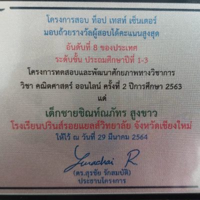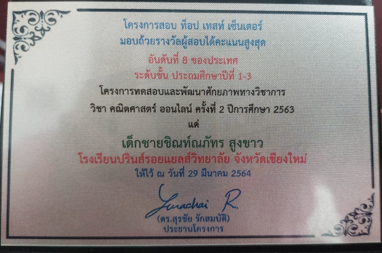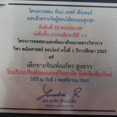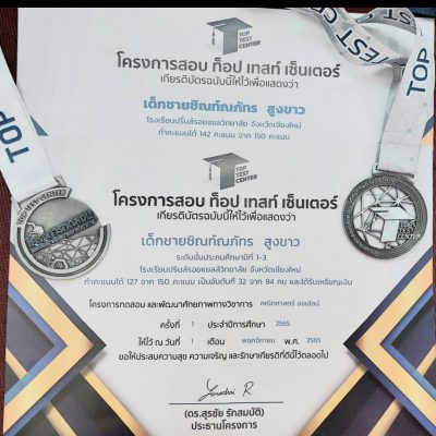 ขอแสดงความยินดีกับเด็กชายชิณท์ณภัทร สูงขาว ชั้น ป.3/11 ได้รับรางวัลเหรียญเงิน “คณิตศาสตร์ ระดับ “ป.1-ป.3 โครงการทดสอบและพัฒนาศักยภาพทางวิชาการ สอบวันที่ 25 ก.ย.65 ประกาศผล 30 ตุลาคม 65 เมื่อวันที่ 2 พฤศจิกายน 2565 ณ ศูนย์ Top test จัดโดยหน่วยงาน Top test center (Thailand) (ระดับประเทศ)