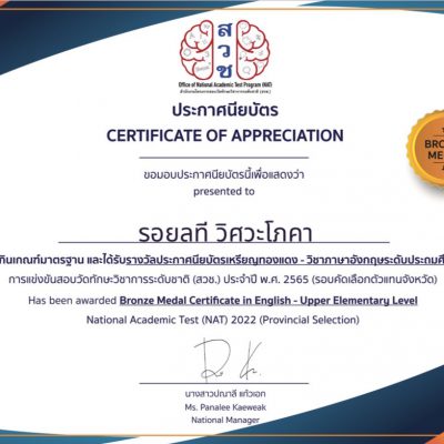 ที่ได้รับรางวัลประกาศนียบัตรเหรียญทองแดง วิชาภาษาอังกฤษระดับประถมศึกษาตอนปลาย