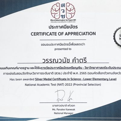 ขอแสดงความยินดีกับเด็กหญิงวรรณวนัช คำตรี ชั้น ป.3/3 ได้รับรางวัล ประกาศนียบัตรเหรียญเงิน วิชาวิทยาศาสตร์ ระดับประถมศึกษาตอนต้น และ ประกาศนียบัตรเหรียญทองแดง วิชาภาษาอังกฤษ ระดับประถมศึกษาตอนต้น การแข่งขันสอบวัดทักษะวิชาการระดับนานาชาติ (สวช.) ประจำปี 2565 รอบคัดเลือกตัวแทนจังหวัด ณ สนามสอบโรงเรียนปรินส์รอยแยลวิทยาลัย เมื่อวันที่ 12 พฤศจิกายน 2565 จัดโดย สำนักงานโครงการสอบวัดทักษะวิชาการระดับชาติ ระดับจังหวัด