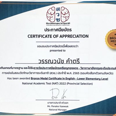 ด.ญ. วรรณวนัช ชั้น ป.3/3 ; ประกาศนียบัตรเหรียญเงิน วิชาวิทยาศาสตร์และประกาศนียบัตรเหรียญทองแดง วิชาภาษาอังกฤษการแข่งขันสอบวัดทักษะวิชาการระดับนานาชาติ (สวช.) ประจำปี 2565