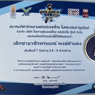 ขอแสดงความยินดีกับเด็กชายวชิรพรหมณ์ พงษ์คำแดง อนุบาล 3/11 รางวัลรางวัลชนะเลิศลำดับที่ 7 รุ่นอายุ 5.6 – 6 ปี ชาย การแข่งขันจักรยาน หนูน้อยขาไถ ชิงแชมป์ประเทศไทย (Balance Bike Thailand Championships) ชิงถ้วยพระราชทาน สนามที่ 2 ประจำปี 2565 ณ สนามจักรยานขาไถ ภายในสวนกีฬากมล ถนนสุวินทวงศ์ กรุงเทพฯ วันที่ 18 ธันวาคม 2565