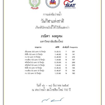จากการแข่งขันว่ายน้ำ วันกีฬาแห่งชาติ จัดโดยการกีฬาแห่งประเทศไทย ระหว่างวันที่ 16-18 ธันวาคม 2565 ณ สระว่ายน้ำสมโภชเชียงใหม่ 700 ปี