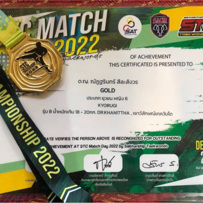 ขอแสดงความยินดีกับเด็กหญิงณัฏฐรินทร์ สีละสังวร อนุบาล 3/1 รางวัล GOLD จากการแข่งขันเทควันโดประเภทต่อสู้ยุวชนหญิง 6 ปี รุ่นน้ำหนัก 18 – 20กิโลกรัม ในการแข่งขันกีฬาเทควันโด รายการ TAEKWONDO CHAMPIONSHIP STC MATCH DAY 2022 เมื่อวันที่ 25 ธันวาคม 2565 ณ มหาวิทยาลัยพายัพ จังหวัดเชียงใหม่