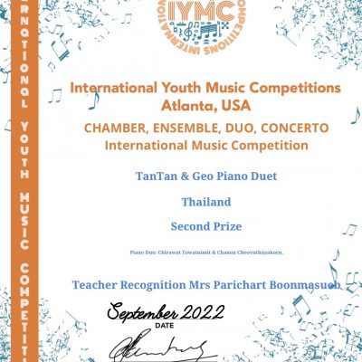 ขอแสดงความยินดีกับ นายจิระวัฒน์ โตวัฒน์นิมิต อายุ 15 ปี นักเรียนชั้นมัธยมศึกษาปีที่ 3 ได้รับรางวัลที่ 2 ในการแข่งขันเปียโน (on line) ประเภททีม CHAMBER, DUO, CONCERTO SECOND PRIZE (90-94%) ชื่อทีม TanTan & Geo Piano Duet รุ่นอายุ 14 – 18 Thailand จัดโดย INTERNATIONAL YOUTH MUSIC COMPETITIONS (IYMC) ประเทศสหรัฐอเมริกา