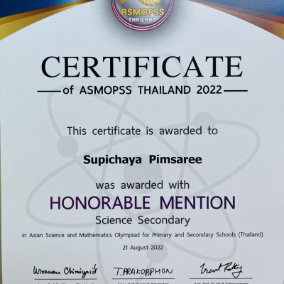 ขอแสดงความยินดีกับ เด็กหญิงสุพิชญา พิมสารี นักเรียนชั้นมัธยมศึกษาปีที่ 1 ได้รับรางวัลเกียรติบัตรชมเชยในการสอบแข่งขันวิชาวิทยาศาสตร์ระดับชั้นมัธยมศึกษาตอนต้น : Honorable Mention Science Secondary Certificate รายการแข่งขัน: ASMOPSS THAILAND 2022 การแข่งขันทางวิชาการ ระดับประเทศ ประจำปี พ.ศ. 2565 จัดโดย Asian Science & Mathematics Olympiad for Primary and Secondary Schools สอบวันที่ 21 สิงหาคม 2565
