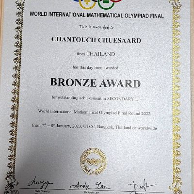 ขอแสดงความยินดีกับ เด็กชายฉันทัช เชื้อสะอาด นักเรียนชั้นมัธยมศึกษาปีที่ 2 ได้รับรางวัล เหรียญทองแดง BRONZE AWARD จากนักเรียนกว่า 900คน จาก 14 ประเทศ ในการแข่งขัน WIMO : World International Mathematics Olympiad 2022 หรือในนาม รายการแข่งขัน คณิตศาสตร์โอลิมปิกวิชาการ 2022 จัดขึ้นเมื่อวันที่ 7-8 มกราคม 2566 โดยประเทศไทยเป็นเจ้าภาพ สถานที่จัดการแข่งขัน มหาวิทยาลัยหอการค้าไทย จัดโดย OCEC กระทรวงศึกษาธิการแห่งประเทศฮ่องกง นักเรียนที่สามารถเข้าร่วมการแข่งขันในรายการ WIMO 2022 คือ นักเรียนที่ได้เหรียญทองจากสนามการแข่งขัน 3 สนาม ได้แก่ HKIMO Final TIMO Final และ BIG BAY BEI Final เท่านั้น ดังนั้น WIMO จึงเป็นการแข่งขันรายการสุดยอดที่สุดแห่งปีของนักเรียนคณิตศาสตร์เหรียญทองจากทั่วโลกที่ได้มาเจอกันในสนามนี้