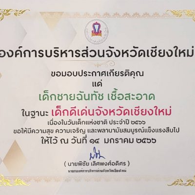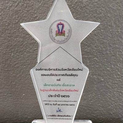 ขอแสดงความยินดีกับ เด็กชายฉันทัช เชื้อสะอาด ชั้นมัธยมศึกษาปีที่ 2 ได้รับโล่รางวัล ใบประกาศเกียรติคุณ ในฐานะเด็กดีเด่นจังหวัดเชียงใหม่ พร้อมทุนการศึกษา จากองค์การบริหารส่วนจังหวัดเชียงใหม่ เนื่องในวันเด็กแห่งชาติ เมื่อวันที่ 14 เดือน มกราคม พ.ศ. 2566 ณ สวนเฉลิมพระเกียรติ 82 พรรษา จังหวัดเชียงใหม่