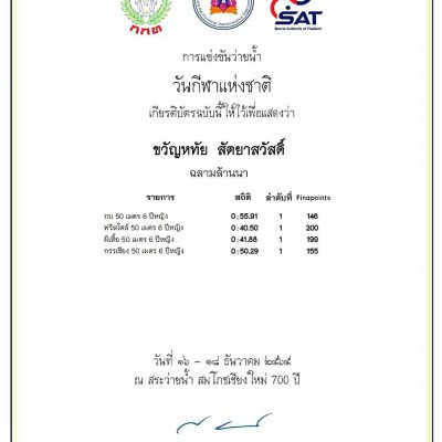 ขอแสดงความยินดีกับเด็กหญิงขวัญหทัย สัตยาสวัสดิ์ ชั้น ป.1/4 เข้าร่วมการแข่งขันว่ายน้ำกีฬาแห่งชาติ ประจำปี 2565 ได้รับถ้วยรางวัลนักกีฬายอดเยี่ยม อันดับที่ 1 รุ่นอายุ 6 ปี และ 5 เหรียญทอง ท่าฟรีสไตล์ ระยะ 50 เมตร , ท่าผีเสื้อ ระยะ 50 เมตร , ท่ากบ ระยะ 50 เมตร , ท่ากรรเชียง ระยะ 50 เมตร , เกาะโฟมแตะขาฟรีสไตล์ ระยะ 50 เมตร ณ สระว่ายน้ำ การกีฬาแห่งประเทศไทย เชียงใหม่(สระสมโภช 700ปี) ระหว่างวันที่16-18 ธันวาคม 2565 จัดโดย การกีฬาแห่งประเทศไทยภาค5 และ องค์การบริหารส่วนจังหวัดเชียงใหม่ ระดับจังหวัด