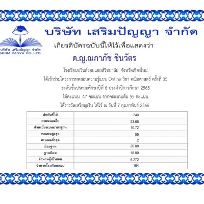 ที่ได้รับรางวัลเหรียญเงิน การทดสอบความรู้วิชาคณิตศาสตร์ ครั้งที่ 35 จัดโดย บริษัท เสริมปัญญา จำกัด วันที่ 7 กุมภาพันธ์ 2566