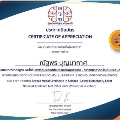 ขอแสดงความยินดีกับเด็กหญิงณัฐพร บุญมากาศ ชั้น ป.3/4 ได้รับรางวัลประกาศนียบัตรเหรียญทองแดง การแข่งขันสอบวัดทักษะวิชาการระดับชาติ (สวช.) ประจำปี พ.ศ. 2565 (รอบคัดเลือกตัวแทนจังหวัด) วิชาวิทยาศาสตร์ ระดับประถมศึกษาตอนต้น ได้รับเมื่อวันที่ 7 ธันวาคม 2565 จัดโดย สำนักงานโครงการสอบวัดทักษะวิชาการระดับชาติ (สวช.) ระดับจังหวัด