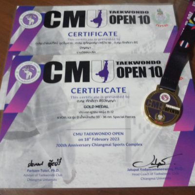 ที่ได้รับรางวัล เหรียญทอง ประเภทต่อสู้เดี่ยวยุวชนหญิง รุ่นอายุ 11-12 ปี และ รางวัลเหรียญทอง ประเภทต่อสู้ทีมยุวชนหญิง รุ่นอายุ 11-12 ปี จากการเเข่งขัน CMU TAEKWONDO OPEN 18 February 2023 700th Anniversary Chiangmai sports complex (ระดับจังหวัด) เมื่อวันที่ 18 กุมภาพันธ์ 2566 ณ สนามกีฬาสมฌภชเชียงใหม่ 700 ปี