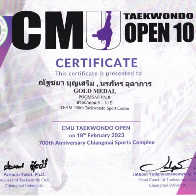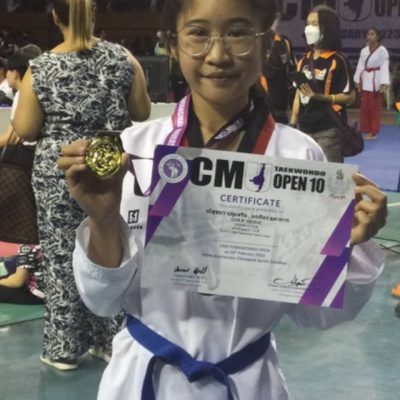 ที่ได้รับรางวัล ชนะเลิศเหรียญทอง จากการเเข่งขัน CMU TAEKWONDO OPEN 18 February 2023 700th Anniversary Chiangmai sports complex (ระดับจังหวัด) เมื่อวันที่ 18 กุมภาพันธ์ 2566 ณ สนามกีฬาสมฌภชเชียงใหม่ 700 ปี