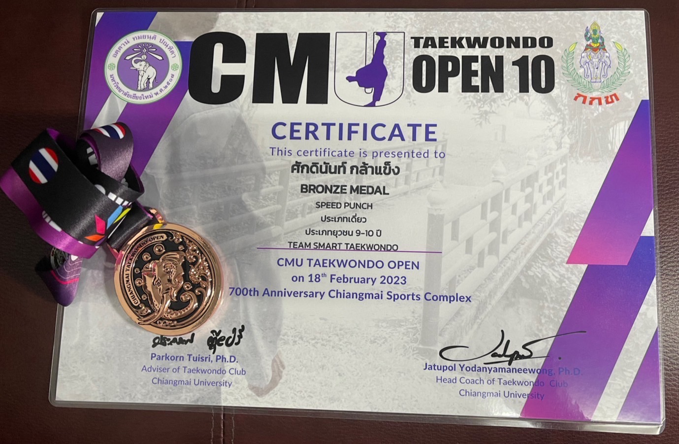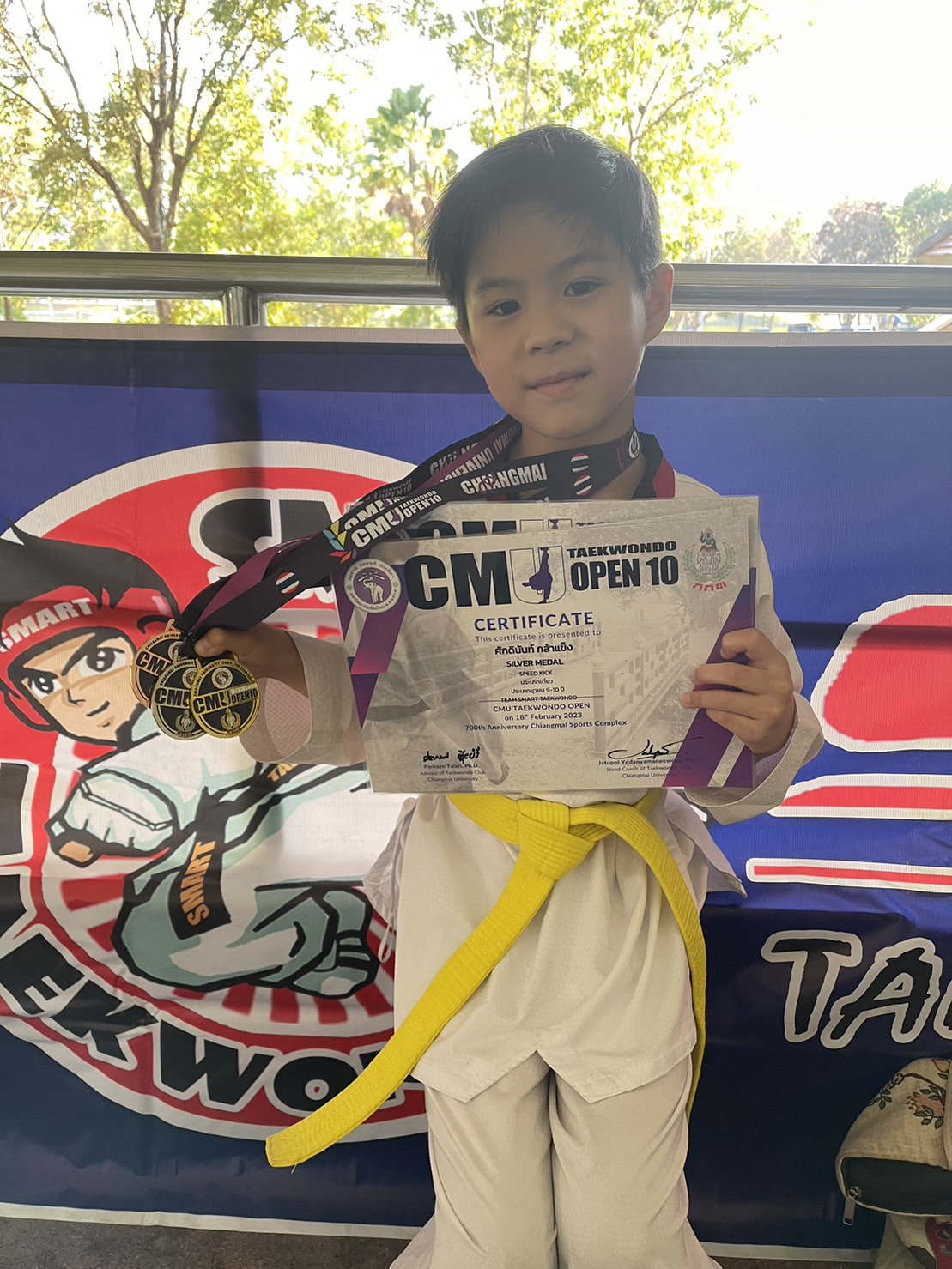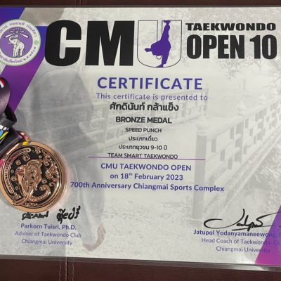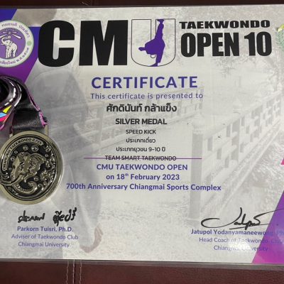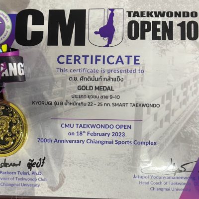 ขอแสดงความยินดีกับเด็กชายศักดินันท์ กล้าแข็ง ชั้น ป.3/6 เข้าร่วมการแข่งขันกีฬาเทควันโด้ รายการ CMU TAEKWONDO OPEN ครั้งที่ 10 ได้รับ รางวัลชนะเลิศ 1 เหรียญทอง ประเภทต่อสู้ยุวชน 9-10 ปี KYORUGI รุ่น B น้ำหนัก22 – 25 กิโลกรัม , 1 เหรียญเงิน ประเภท Speed Kick ประเภทเดี่ยว และ 1 เหรียญทองแดง ประเภท Speed Punch ประเภทเดี่ยว จากทีม SMART TAEKWONDO ณ. สนามกีฬา 700th Anniversary Chiangmai Sports Complex เมื่อวันที่ 18 กุมภาพันธ์ 2023 จัดโดย มหาวิทยาลัยเชียงใหม่ร่วมกับสมาคมกีฬาเทควันโด เชียงใหม่ ระดับจังหวัด