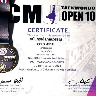 ขอแสดงความยินดีกับเด็กหญิงชนันภรณ์ มาลัยวรรณ ชั้น ป.2/8 เข้าร่วมการแข่งขันกีฬาเทควันโด รายการ CMU TAEWONDO OPEN 10 ได้รับรางวัลเหรัียญทอง ( GOLD MEDAL ) SPEED KICK ประเภทเดี่ยว ประเภทยุวชน 7 – 8 ปี ณ สนามสมโภชเชียงใหม่ 700 ปี เมื่อวันที่ 18 กุมภาพันธ์ 2566 จัดโดย มหาวิทยาลัยเชียงใหม่ร่วมกับสมาคมกีฬาเทควันโด เชียงใหม่ ระดับจังหวัด