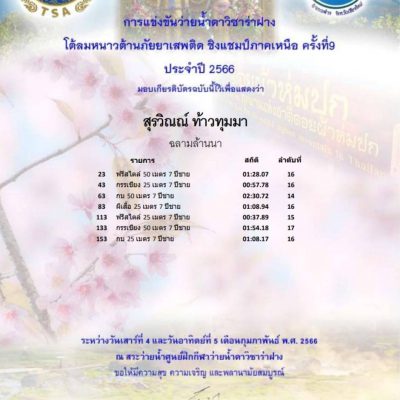 ขอแสดงความยินดีกับเด็กชายสุรวิณณ์ ท้าวทุมมา อนุบาล 3/4 ได้รับรางวัล 2 เหรียญทอง และ 1 เหรียญทองแดง รุ่น 7 ปี ชาย การแข่งขันว่ายน้ำดาวิซาร่าฝางต้านลมหนาวต้านยาเสพติด ชิงแชมป์ภาคเหนือ ครั้งที่ ๙ ณ สระว่ายน้ำศูนย์ฝึกกีฬาว่ายน้ำดาวิซาร่าฝาง อำเภอฝาง จังหวัดเชียงใหม่ วันที่ 4 – 5 กุมภาพันธ์ 2566