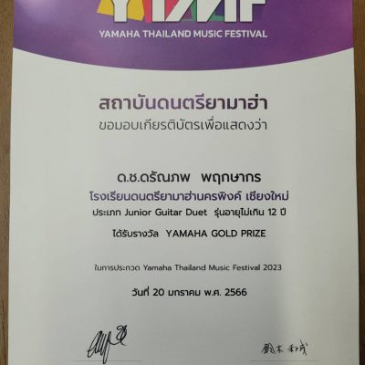 ที่ได้รับรางวัลเหรียญทอง YAMAHA GOLD PRIZE ประเภท Junior Guitar Duet รุ่นอายุไม่เกิน 12 ปี จากการเเข่งขัน YAMAHA THAILAND MUSIC FESTIVAL 2023ทเมื่อวันที่ 20 มกราคม 2566