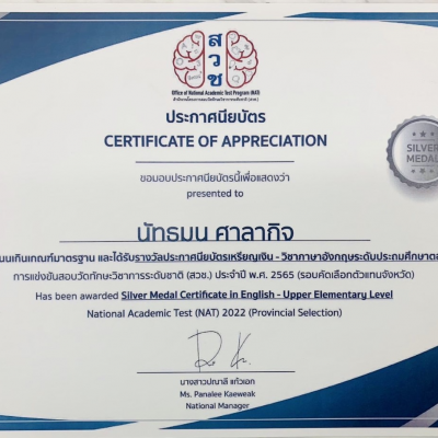ที่ได้รับประกาศนียบัตรเหรียญเงิน วิชาภาษาอังกฤษระดับประถมศึกษาตอนปลาย การแข่งขันสอบวัดทักษะวิชาการระดับชาติ (สวช.) ประจำปี พ.ศ.2565