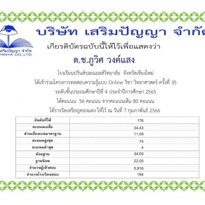 ที่ได้รับรางวัลเหรียญทองแดง โครงการทดสอบความรู้แบบ Online วิชาวิทยาศาตร์ ครั้งที่ 35 จัดโดย บริษัทเสริมปัญญา จำกัด เมื่อวันที่ 7 กุมภาพันธ์ 2566