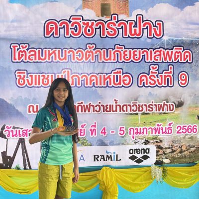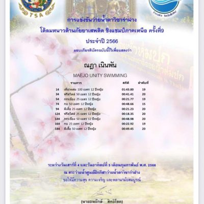 ที่ได้รับรางวัล 8 เหรียญรางวัลจากการแข่งขัน 9 รายการ (ระดับภาคเหนือ) 6 เหรียญเงิน รุ่นอายุ 12 ปี หญิง ท่าฟรีสไตล์ 50 เมตร , ท่ากรรเชียง 25เมตร , ท่าผีเสื้อ 25 เมตร , ท่าฟรีสไตล์ 25 เมตร , ท่ากรรเชียง 50 เมตร และ ท่าผีเสื้อ 50 เมตร 2 เหรียญทองแดง รุ่นอายุ 12 ปี หญิง ท่าเดี่ยวผสม 100 เมตร และ ท่ากบ 50 เมตร จากการแข่งขันว่ายน้ำดาวิซาร่า ต้านลมหนาว ต้านยาเสพติด ชิงแชมป์ภาคเหนือ ครั้งที่ 9 ระหว่างวันที่ 4-5 กุมภาพันธ์ 2566 ณ สระว่ายน้ำศูนย์ฝึกกีฬาว่ายน้ำดาวิซาร่าฝาง อำเภอฝาง จังหวัดเชียงใหม่