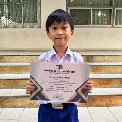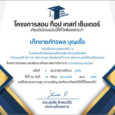 ขอแสดงความยินดีกับเด็กชายภัทรพล บุญเชื้อ ชั้น ป.3/3 เข้าร่วมโครงการทดสอบและพัฒนาศักยภาพทางวิชาการ ประจำปี 2566 ระดับชั้นประถมศึกษา ปีที่ 1-3 ได้รับรางวัลเหรียญทอง วิชาภาษาอังกฤษ ทำคะแนนได้ 197 จาก 200 คะแนน เป็นอันดับที่ 5 ของประเทศ จาก 260 บาทคน ทั่วประเทศ จัดโดย โครงการสอบ ท็อป เทสท์ เซ็นเตอร์