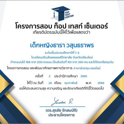 ขอแสดงความยินดีกับเด็กหญิงธารา  วสุนธราพร  ชั้น ป.1/3 เข้าร่วมโครงการทดสอบและพัฒนาศักยภาพทางวิชาการ  ครั้งที่ 2 ประจำปีการศึกษา 2565   ได้รับรางวัล เหรียญเงิน  วิชาภาษาอังกฤษ   ทดสอบแบบออน์ไลน์  เมื่อวันที่ 28 กุมภาพันธ์ 2566  จัดโดย TOP TEST CENTER  ระดับประเทศ
