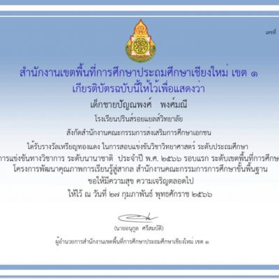 ระดับเขตพื้นที่การศึกษา โครงการพัฒนาคุณภาพการเรียนรู้สู่สากล สำนักงานคณะกรรมการการศึกษาขั้นพื้นฐาน เมื่อวันที่ 18 กุมภาพันธ์ 2566