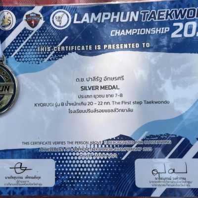 เด็กชายปาลีรัฐ อักษรศรี ป.1/5 เข้าร่วมการแข่งขันชิงแชมป์ภาคเหนือ เทควันโดลำพูนแชมป์เปี้ยนชิพ 2023 ได้รับรางวัล SILVER MEDAL ( เหรียญเงิน ) ประเภทยุวชนชาย 7 – 8 ปี น้ำหนักเกิน 20 – 22 ก.ก. ( The First step Taekwondo ) โรงเรียนปรินส์รอยแยลส์วิทยาลัย ณ หอประชุมองค์การบริหารส่วนจังหวัดลำพูน จ.ลำพูน เมื่อวันที่ 18 มีนาคม 2566 จัดโดยชมรมเทควันโดลำพูน ระดับ ภาคเหนือ