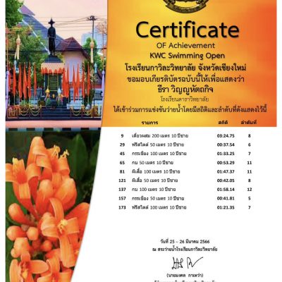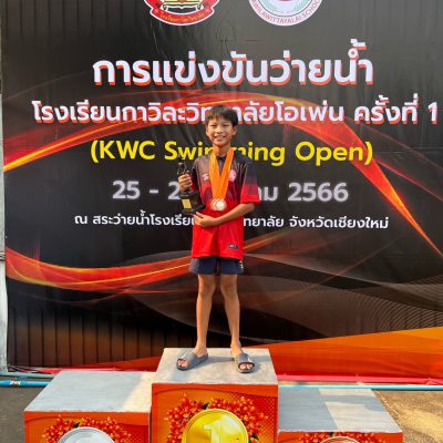 2 เหรียญทองแดง รายการ กบ 50 เมตรและ ผีเสื้อ 100 เมตร และได้รับถ้วยรางวัลชนะเลิศอันดับ 9 รุ่น 10 ปีชาย จากการแข่งขันว่ายน้ำ ณ โรงเรียนกาวิละวิทยาลัย (KWC Swimming Open) ครั้งที่ 1 การแข่งขันระดับภาคเหนือ จัดโดย ศูนย์ฝึกกีฬาว่ายน้ำกาวิละวิทยาลัย ณ สระว่ายน้ำโรงเรียนกาวิละวิทยาลัย เชียงใหม่ ระหว่างวันที่ 25-26 มีนาคม 2566