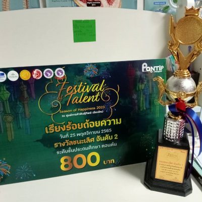 ขอแสดงความยินดีกับเก็กหญิงด.ญ.ธนัทอร คงชาตรี ป.3/2 เข้าร่วมการแข่งขันภาษาไทยในรายการเรียงร้อยถ้อยความ ได้รับรางวัลชนะเลิศอันดับ 2 ในระดับประถมศึกษาตอนต้น เป็นการแข่งขันระดับจังหวัด ตามโครงการ Festival of Talent Season of Happiness 2023 เมื่อวันที่ 25 พฤศจิกายน 2565 จัดที่ศูนย์การค้าพันธุ์ทิพย์ เชียงใหม่