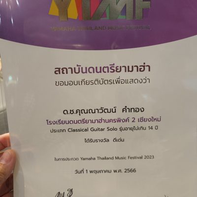 ขอแสดงความยินดีกับ เด็กชายคุณณาวัฒน์ คำทอง นักเรียนชั้นมัธยมศึกษาปีที่ 2 ได้รับรางวัลดีเด่น ในการประกวด Yamaha Thailand Music Festival 2023 ประเภท Classical Guitar soloรุ่นอายุไม่เกิน 14 ปี รอบชิงชนะเลิศ จัดขั้นที่ มหิดลสิทธาคาร วิทยาลัยดุริยางคศิลป์ มหาวิทยาลัยมหิดล วันที่ 1 พค.2566