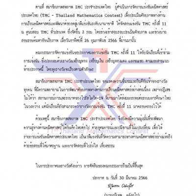 ขอแสดงความยินดีกับ เด็กหญิงชนกภรณ์ คำอินต๊ะ นักเรียนชั้นมัธยมศึกษาปีที่ 3 รางวัล Merit Award จากการแข่งขันคณิตศาสตร์แห่งประเทศไทย (TMC-Thailand Mathematics Contest)ครั้งที่ 11 ซึ่งจัดโดยสมาชิกสหภาพ IMC ประเทศไทยเป็นการแข่งขันระดับชาติในระดับชั้นมัธยมศึกษาปีที่ 2 ซึ่งสอบ 26 กุมภาพันธ์ 2566 ที่ผ่านมา ณ สนามสอบโรงเรียนอนุบาลเชียงใหม่