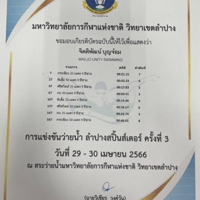 ขอแสดงความยินดีกับด.ช.จิตติพัฒน์ บุญจ๋อม ชั้น ป.3/7 ได้เข้าร่วมการแข่งขันว่ายน้ำลำปางสปริ้นเตอร์ ครั้งที่ 3 ณ สระว่ายน้ำมหาวิทยาลัยการกีฬาแห่งชาติวิทยาเขตลำปาง ระหว่างวันที่ 29 ถึง 30 เมษายน 2566