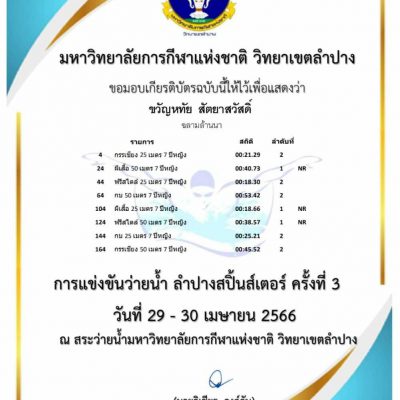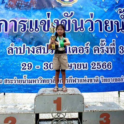 ขอแสดงความยินดีกับ เด็กหญิงขวัญหทัย สัตยาสวัสดิ์(ขวัญ) ชั้น ป.2/1 ได้รับรางวัล 3 เหรียญทอง(ท่าฟรีสไตล์ 50 เมตร ท่าผีเสื้อ 50 เมตร และท่าผีเสื้อ 25 เมตร) 5 เหรียญเงิน(ท่ากบ 25 เมตร ท่ากบ 50 เมตร ท่่าฟรีสไตล์ 25 เมตร ท่ากรรเชียง 25 เมตร และกรรเชียง 50 เมตร)ลงแข่ง 8 รายการ รุ่นอายุ 7 ปี รายการแข่งขันว่ายน้ำ “ลำปางสปิ้นส์เตอร์” ครั้งที่ 3 ประจำปี 2566 จัดโดย มหาวิทยาลัยการกีฬาแห่งชาติ วิทยาเขตลำปาง วันที่ 29 – 30 เมษายน 2566