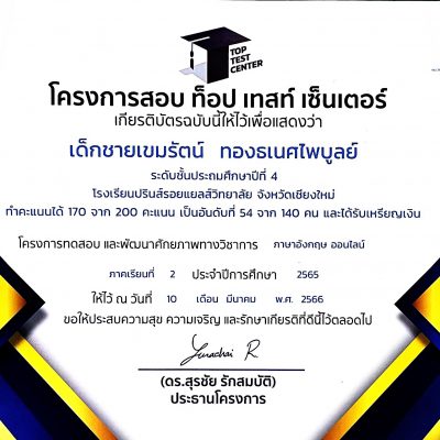 ได้รับเหรียญเงินและเกียรติบัตรวิชาภาษาอังกฤษ (อันดับ 54 คะแนน 170/200 )