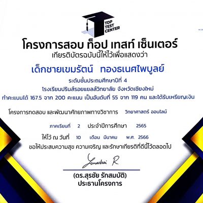 ในโครงการสอบ ท๊อป เทสท์ เซ็นเตอร์ ระดับชั้นประถมศึกษาปีที่ 4 ภาคเรียนที่ 2 ประจำปีการศึกษา 2565