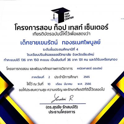 ได้รับเหรียญทอง เกียรติบัตร และถ้วยรางวัลวิชาคณิตศาสตร์ (อันดับ 36 คะแนน 136/150 )