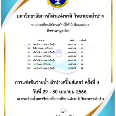 รายการแข่งขันว่ายน้ำ ลำปางสปิ้นส์เตอร์ ครั้งที่ 3 จัดโดย มหาวิทยาลัยการกีฬาแห่งชาติ วิทยาเขตลำปาง (การแข่งขันระดับภาคเหนือ)
