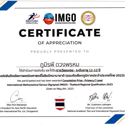 (IMGO – Thailand Regional Qualification 2023) จัดโดย สำนักงานโครงการสอบวัดทักษะวิชาการระดับชาติ – สวช เมื่อวันที่ วันที่ 6 พฤษภาคม 2566