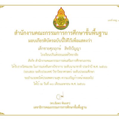 จากการการแข่งขันวิชาวิทยาศาสตร์ ระดับประถมศึกษาการแข่งขันทางวิชาการ ระดับนานาชาติ ประจำปี พ.ศ. 2566 (รอบสอง) จัดโดย สำนักงานคณะกรรมการการศึกษาขั้นพื้นฐาน เมื่อวันที่ 30 เมษายน 2566
