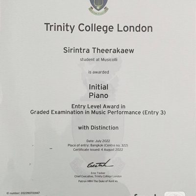- Piano Grade Initial ทำคะแนนได้สูงสุด (100 คะแนนเต็ม) อับดับ 1 ของประเทศไทย