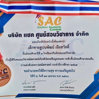 2. รางวัลเกียรติบัตรเหรียญทองแดง ในการสอบแข่งขันคณิตศาสตร์ ระดับมัธยมศึกษาตอนต้น MWC(Math War Contest)การแข่งขันสงครามคณิตศาสตร์ จัดโดย บริษัท แซคศูนย์สอบวิชาการ สอบวันที่ 18 มีนาคม 2566 ออนไลน์