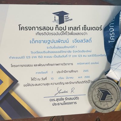 4. รางวัลเกียรติบัตรเหรียญเงิน ในการสอบวิชาคณิตศาสตร์ ระดับมัธยมศึกษาปีที่1จัดโดยโครงการสอบ ท็อปเทสท์ เซ็นเตอร์ สอบวันที่ 18-22 กุมภาพันธ์ 2566 ออนไลน์