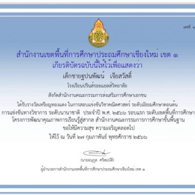 1.รางวัลเกียรติบัตรเหรียญทองแดง ในการสอบแข่งขันคณิตศาสตร์ ระดับมัธยมต้น การแข่งขันวิชาการระดับนานาชาติ(สพฐ.นานาชาติ) ประจำปี 2566 ระดับเขตพื้นที่การศึกษาเชียงใหม่เขต1 สอบวันที่ 18 กุมภาพันธ์ 2566
