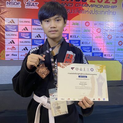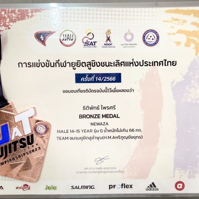 ขอแสดงความยินดีกับ เด็กชายธิติพัทธ์ ไพรศรี นักเรียนชั้นมัธยมศึกษาปีที่ 3 เข้าร่วมการแข่งขันกีฬา ยูยิตสู ชิงชนะเลิศแห่งประเทศไทยครั้งที่ 14 / 2566 ณ อาคารนันทนาการ มหาวิทยาลัยรังสิต ระหว่างวันที่ 7-9 เมษายน 2566 ได้รับรางวัลเหรียญทองแดง ประเภท FIGHTING และ NEWAZA ประเภทอายุ 14-15 ปี น้ำหนักไม่เกิน 66 กก.