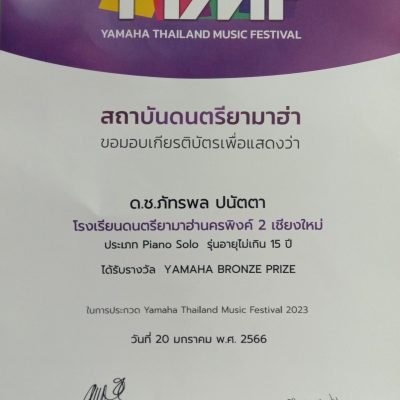 ขอแสดงความยินดีกับ เด็กชายภัทรพล ปนัตตา นักเรียนชั้นมัธยมศึกษาปีที่ 2 ในการประกวด Yamaha Thailand Music Festival 2023 รอบภาคเหนือ